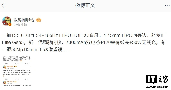 一加 15 手机参数曝光:第五代骁龙 8 至尊版、7300mAh 双电芯等,10 月 27 日发布
